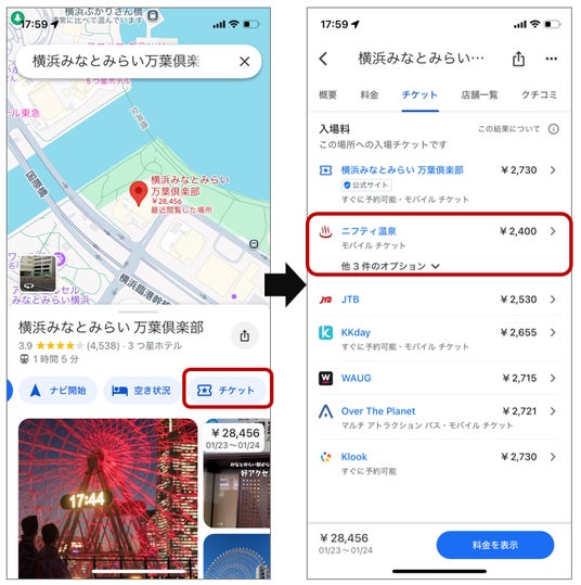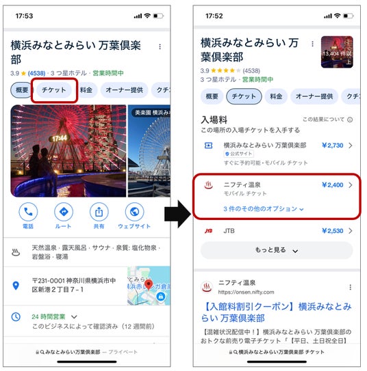 Googleの「おすすめスポット」は、ユーザーが温泉やサウナなどの温浴施設を検索すると、施設の写真や基本情報などの詳細に加えて、チケット情報が表示されます。これにより、料金の比較から購入までをシームレスに行うことができるものです。