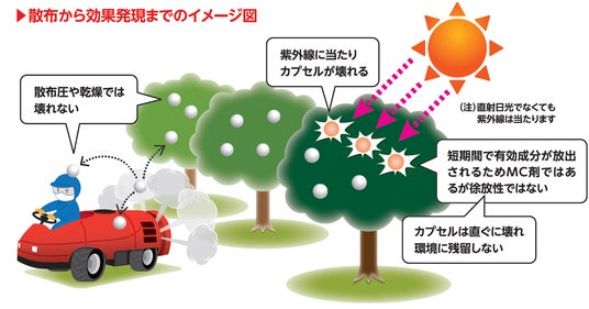 ダイアジノン特有の速効性を活かすべく、散布時には壊れず、散布後に紫外線等によってすみやかに壊れ成分が放出される、新しいコンセプトのマイクロカプセル剤となっています。