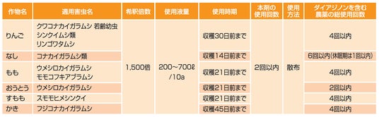 初回登録作物はりんご、なし、もも、おうとう、すもも、かきであり、今後も適用拡大を予定。