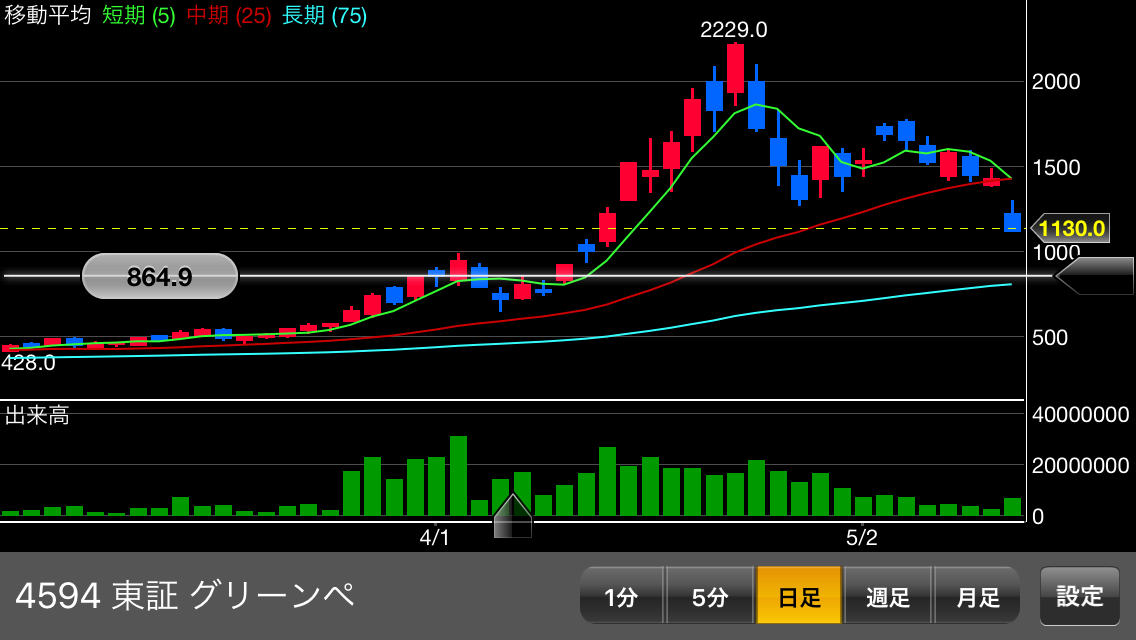 今日は先週金曜日に買ったアライドアーキテクツの100株を握りしめたまま静観の一日でした☆ ★4594 グリーンペプタイド(がん治療・バイオ関連)目先1,300円方向へ突っ込むと今回の上昇相場は一端終了の可能性。 5/16株価1,13... ...続きを読む