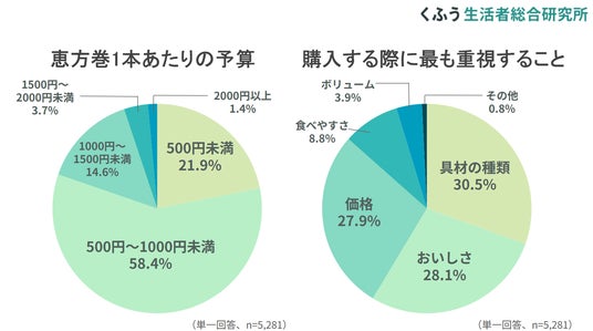 恵方巻を購入する際にもっとも重視することは「具材の種類」(30.5%)、「おいしさ」(28.1%)、「価格」(27.9%)で回答がわかれる結果に。価格だけではなく、内容が重視されていることがわかります。