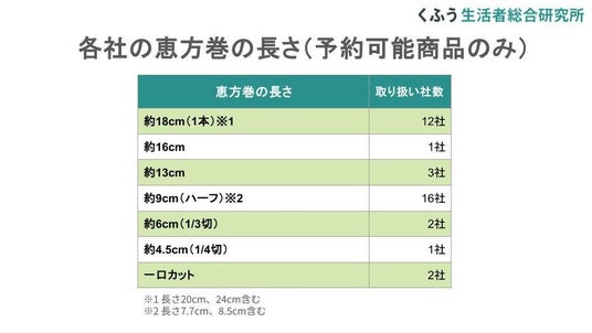 具材が豪華になる一方、アンケートでも挙がった「ボリュームがありすぎて食べにくい」という問題にも各社で工夫が見られます。巻き寿司1本は長さ約18cmが多いですが、ハーフサイズや一口カットなどの多様なサイズ展開があり、予約チラシでは長さや直径のサイズをわかりやすく図示するスーパー・コンビニもみられました。