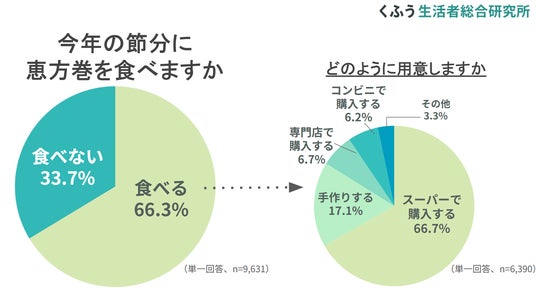今年の節分に「恵方巻を食べる予定」と回答した人は66.3%。3人に2人が食べる予定であり、全国的に節分の風習として定着していることがわかります。恵方巻をどのように用意するかをたずねたところ、「スーパーで購入する」(66.7%)が最多で、「手作りする」(17.1%)、「専門店で購入する」(6.7%)、「コンビニで購入する」(6.2%)と続く結果となりました。