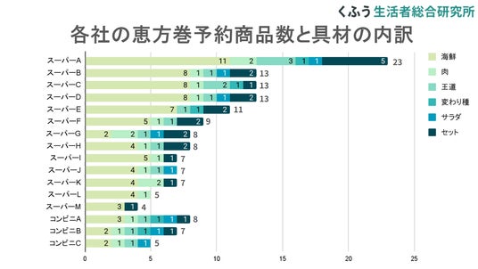 くふう総研は各社の公式ホームページ掲載の情報を元に、スーパー13社、コンビニ3社の2025年恵方巻商品(予約受付商品のみ※2)を調査しました。