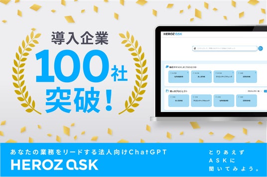 HEROZ株式会社(本社:東京都港区、代表取締役CEO:林 隆弘以下「HEROZ」)が提供するAIアシスタントサービス「HEROZ ASK」の導入企業が100社を突破しました。本サービスはChatGPTなどの生成AIを活用し、社内に存在する様々なデータの検索・要約・翻訳や、音声の言語化を通じて、あらゆる業務をアシストするSaaSサービスです。「HEROZ ASK」は2024年5月より正式にリリースして以来、建設業界、製造業界、IT業界など、大手企業から中小企業まで幅広く、多岐に渡る業界の企業様にご愛顧いただき、半年で導入企業100社を達成するに至りました。