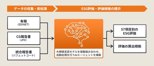 本システムは、上場会社が公開する文書の収集からESGを細分化した57個の項目に対する定量評価を行い、更に説明責任の観点から評価根拠も併せて提示を行います。LLMを含む大規模言語モデルを複数活用し、ESG評価に関する業務知見を有する担当者の評価を再現するアプローチを採択しています。