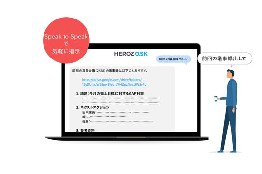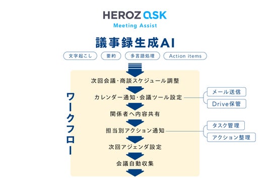 HEROZ株式会社(本社:東京都港区、代表取締役CEO:林 隆弘、以下「HEROZ」)は、法人向け生成AI SaaS「HEROZ ASK」の新機能としてAIエージェント「Meeting Assist」を2025年秋にリリース※いたします。本機能は会議・商談の効率化とそれに付帯する業務フローの自動化による業務最適化を目的としており、未来の働き方を支える先進的ツールとして機能を拡充してまいります。