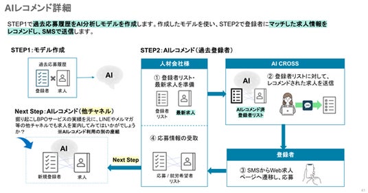 「リピカム」サービスの1つである人材掘り起こしBPOサービスの「AIレコメンド」は、過去の応募履歴をデータ分析することで、応募者にマッチする求人をAIがレコメンドするサービスです。