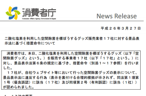 2014年3月27日 クレベリンゲル(置き型) クレベリンマイスティック 消費者庁より景品表示法優良誤認措置命令