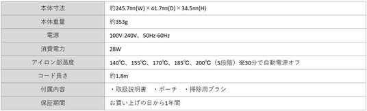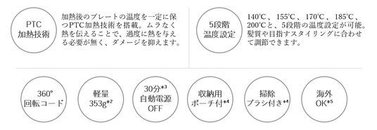 *¹ アクシージアにおいて *² 本体の総重量 *³ 電源を入れてから *⁴ 本体をよく冷ましてからご使用ください。 *⁵ 海外でご使用の場合には、国や地域に合わせて別途プラグアダプターをお買い求めください。 *⁶ 補修成分:メドウフォーム-δ-ラクトン、ステアロイルラクチレートNa *⁷ 補修成分:ラウロイルグルタミン酸ジ(フィトステリル/オクチルドデシル) *⁸ エモリエント成分:(アブラナ種子油/シナアブラギリ種子油)コポリマー *⁹ 帯電防止成分:ココイルアルギニンエチルPCA *¹⁰ ヘアコンディショニング成分:加水分解シルク *¹¹ 保湿成分:ヒマワリ種子油 *¹² 保湿成分:アルガニアスピノサ核油 *¹³ 保湿成分:シア脂 *¹⁴ 保湿成分:イソノナン酸イソノニル、ステアルトリモニウムクロリド、アモジメチコン、ジステアリルジモニウムクロリド、アルギニン、ポリクオタニウム-10、ヒドロキシプロピルメチルセルロースステアロキシエーテル