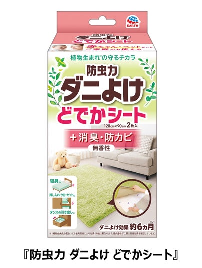 アース製薬株式会社(本社:東京都千代田区、社長:川端克宜、以下 「アース製薬」)は2月3日(月)に、植物由来成分配合によるダニよけ効果だけでなく、消臭と防カビもできる※1大判サイズの『防虫力(ボウチュウリキ) ダニよけ どでかシート』を全国で発売しました。