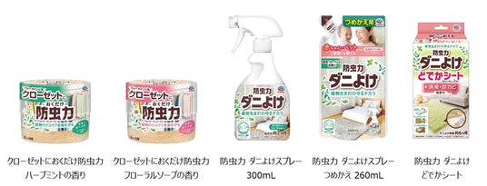 『防虫力』シリーズは、植物成分を配合した置き型タイプの衣類用防虫剤『クローゼットにおくだけ防虫力』や、ダニよけに加えて、除菌、防カビ、ウイルス除去※5、消臭、ダニの死骸やフンなどのハウスダストを除去しやすくする成分を配合した衣類用の『防虫力 ダニよけスプレー』、今回リニューアルした『防虫力 ダニよけ どでかシート』をラインアップしています。使用用途に合わせてお使いください。