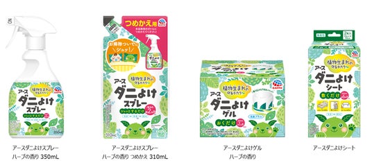 植物成分配合の『アースダニよけ』シリーズは、スプレータイプのほか、置き型タイプやシートタイプなどをラインナップしています。用途に合わせてお使いください。