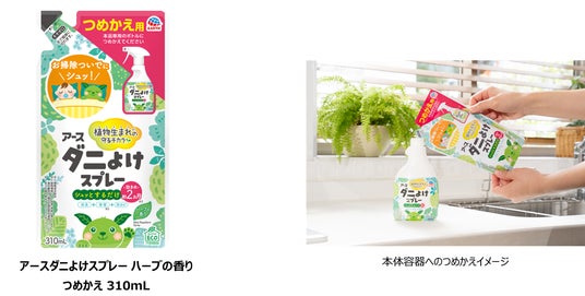 ダニ(ヒョウヒダニ類)は、人のフケやアカ、汗などをエサとして家の中で一年中生息すると言われており、気温25~30度、湿度60~80%の高温多湿を好みます。これからの季節は特にダニの繁殖が加速するため、定期的な対策が重要です。そこで当社は、手軽にダニ対策ができる『アースダニよけスプレー』に、繰り返し使えて環境にもやさしいつめかえ用を新たにラインナップしました。容器を捨てずにサステナブルに長くお使いいただけます。