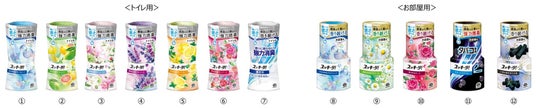 さらに、使用場所によって消臭や香りへの期待度が異なることから※1、トイレ用には消臭剤、お部屋用は香料中の天然精油の成分を増量しています※2。トイレ用は7種類、お部屋用は5種類の香りを取り揃え、お好みに合わせてお選びいただけます。