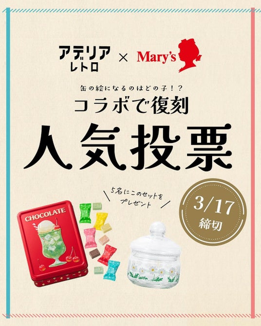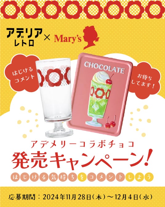 2024年12月6日(金)より、メリーオンラインショップ限定で「はじけるキャンディチョコレート。×アデリアレトロ コラボBOX」が発売されます。花だん柄の脚付きグラスと、限定デザインのアソートメント缶などがセットになった商品です。このコラボBOX発売をより盛り上げるべく、アデリアレトロからも「ボンボン入れ(ミニ) 花だん」と「プレート120 花だん」を同日に発売する運びとなりました。ボンボン入れにはチョコを入れて楽しんだり、プレートにはチョコを乗せてティータイムなど、コラボBOXのはじけるキャンディチョコレート。と組み合わせるとよりかわいらしく演出できるアイテムです。また、コラボ商品の発売を記念して両社Instagramでプレゼントキャンペーンを実施いたします。