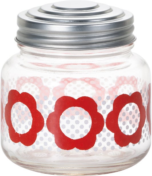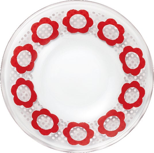 【「花だん」について】白い水玉模様と赤いお花がキュートな「花だん」は昭和47(1972)年に発売された柄です。昭和当時は、お菓子などを入れるガラス容器や、カップ&ソーサーとして販売されていました。ビビッドな赤色で大胆にレイアウトされたお花はまさに昭和らしく、ポップでチャーミングなデザインです。ところどころに見られるガラス絵の具のかすれやにじみも、味わい深いものがあります。