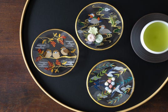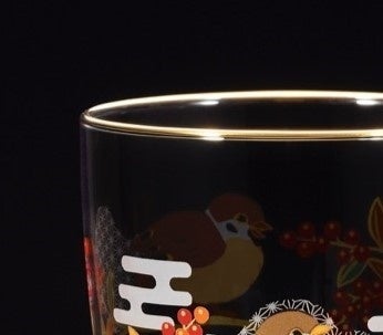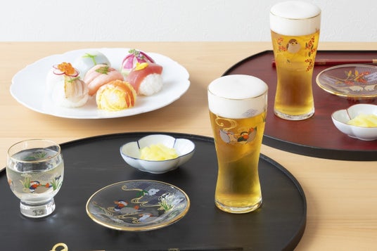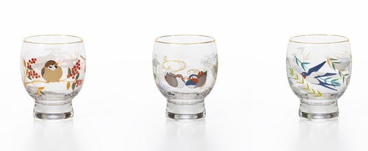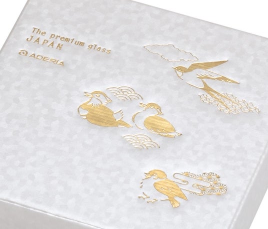 日本の四季折々の風景を彩る鳥をモチーフに美しい草花と吉祥文様を組み合わせ、「雀と南天」「鴛鴦(おしどり)と菖蒲」「燕と柳」の3柄をデザインしました。口部や皿の縁に一つひとつ手作業で施された金巻きが華やかなグラスウェアは、金色の箔押し仕様の高級感のあるパッケージで大切な方への贈り物や、豊かなひとときを過ごすのにぴったりです。