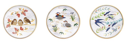 丸皿(雀と南天、鴛鴦と菖蒲、燕と柳)品番:6844、6845、6846