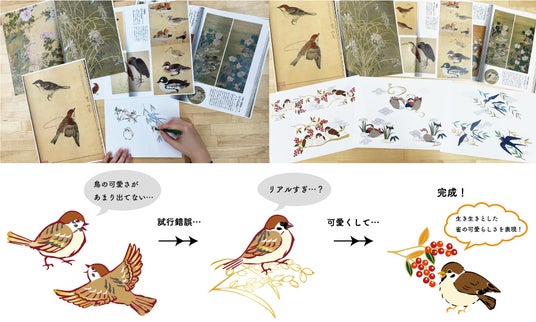 従来のプレミアムニッポンテイストは、日本の伝統的な文様や意匠を描いたグラスウェアですが、日本の自然や身近な風景もまた、日本文化の重要な要素です。「吉祥花鳥」は、「花鳥画(かちょうが)」にインスピレーションを受け、日本の四季折々の風景を彩る鳥や植物をモチーフに日本の美を表現しました。「花鳥画」とは、中国で発祥した草花、鳥、虫など動植物を主題とした東洋絵画の画題です。その芸術性や縁起の良さから親しまれ、贈答品としても使われた歴史があります。