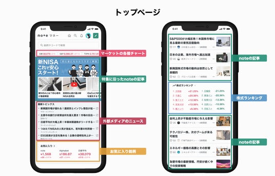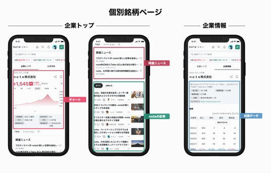 これにより、すでに投資をしている方をはじめ、資産形成に関心を持つ人たちの目に、noteのクリエイターの記事がふれる機会をさらに増やします。また財務データやニュース、各種チャートもこれらのページに連携。投資家は必要な情報を一カ所でまとめて確認できます。