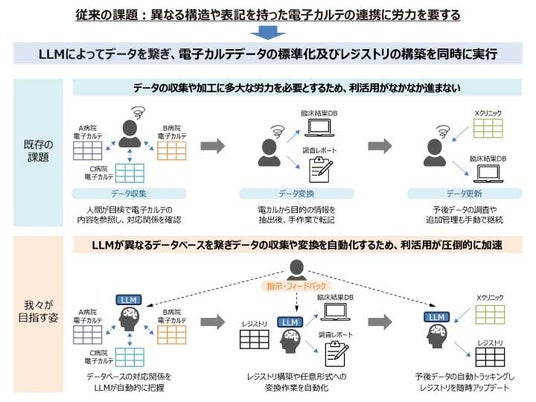 こうした現状の電子カルテの課題解決に有効な手法が、先駆的な医療LLMの実装です。各医療機関で異なるフォーマットの電子カルテデータを、医療LLMを用いて繋ぎ、データの収集や変換を自動化することで、電子カルテデータの標準化およびレジストリ※3の実現を目指すことが可能となります。また医療機関間でデータが統合されることで、医療機関を横断した被験者の探索や被験者データの抽出、データトラッキングなど、医療におけるプロセスの効率化が大幅に向上します。
