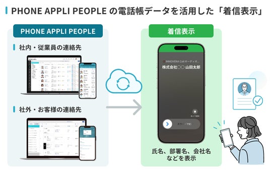 PHONE APPLI PEOPLEは、社内外の連絡先をクラウド上に安全に保管し、一元管理できるため、専用アプリを通じて安心・安全な通話が可能です。今回の連携により、従来の「発信連携機能」に加えて、PHONE APPLI PEOPLEのデータを活用した「着信表示」と「着信履歴の同期」を新たに実装しました。これにより、着信時に相手の情報(氏名、部署名、会社名など)が表示され、電話に出る前に用件をイメージした状態で会話をすることができ、よりスムーズな業務対応をサポートします。