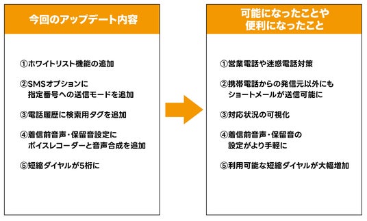 今回新たに5種追加する機能も、電話応対をより効率的に行えるようになるものや、設定を手軽に行なうためのものです。