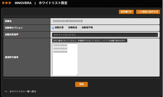 〈設定方法〉「回線」→「ホワイトリスト一覧」より設定いただけます。
