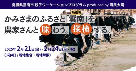 島根県雲南市と連携し、 2025年2月21日(金)~2月24日(月・祝)の3泊4日で雲南市の生産者の元での自然体験と、親御さんへのワーケーション環境を提供する「島根県雲南市親子ワーケーション 」の申し込み受付を2024年12月3日(火)より開始します。