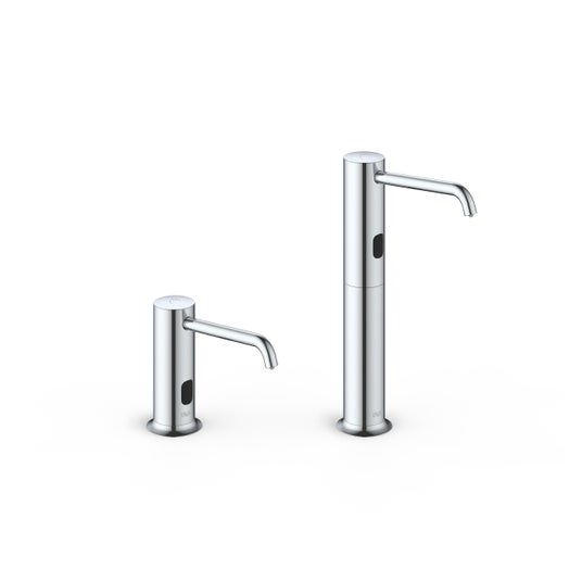 タッチレスで手をかざすだけで衛生的にお使いいただける自動水石けん供給栓です。水石けんの吐出量を2段階調節することができて経済的。残量はLEDで確認できます。水石けんタンク1つで3連まで接続できるので、水石けんの補充の手間を省けます。