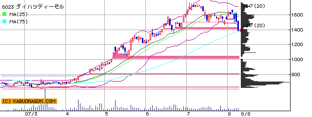 高値圏での三羽ガラス、ボリバン-2σ下抜け。目標株価は、2007年6月22日に空いた窓の1405円。