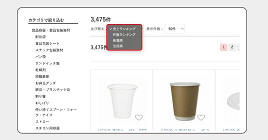 「売上ランキング」「件数ランキング」「新着順」「注目順」といった並び替え項目を実装しました。これによりユーザーは検索結果ページの商品の表示順をニーズに合わせて並び替えることができるようになり、利便性向上に寄与します。