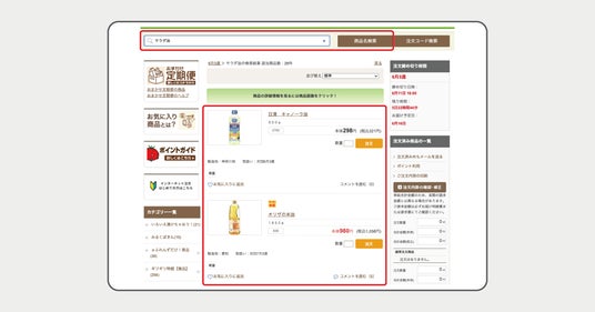 例:「サラダ油」と検索すると、「キャノーラ油」「米油」など検索ワードと関連した商品が表示されます