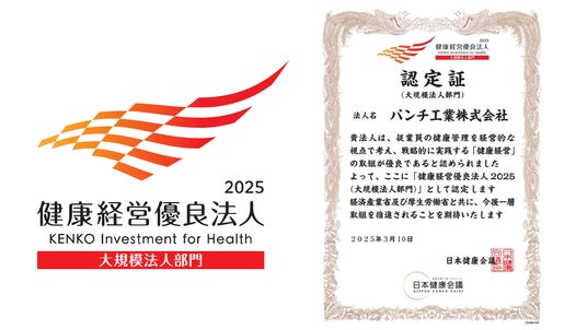 パンチ工業株式会社(以下、パンチ工業)は、2025年3月10日付けで、従業員の健康管理を経営的な視点で考えて戦略的に実践する「健康経営」の取組みが優良であると認められ、経済産業省および日本健康会議が共同で認定を行う「健康経営優良法人2025(大規模法人部門)」に初めて認定されました。