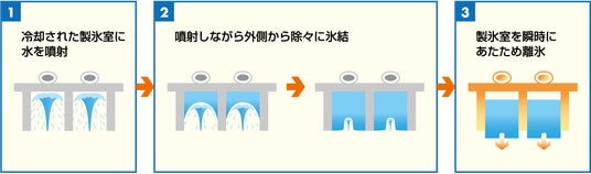 「キューブアイスメーカー」は、ジュース、水、アイスコーヒー、水割りなどに使われる、約3センチの立方体に近い、透明な氷の製氷機です。零下25℃に冷却された製氷室に下から水を噴射しながら製氷します。水を流動させながら徐々に凍らせることで不純物を除去し、透明で溶けにくい氷となります。ホシザキの国内製氷機標準ラインナップの約7割を占めています。