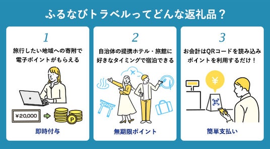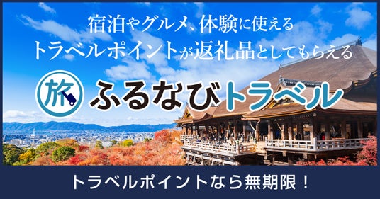「ふるなびトラベル」は、ふるさと納税先にある提携店(ホテル・飲食店など)で無期限にご利用可能な旅行ポイント(ふるなびトラベルポイント)を、返礼品として受け取れるサービスです。「ふるなびトラベルポイント」は、1ポイント=1円で提携店(ホテル・飲食店など)のお会計にご利用いただけます。