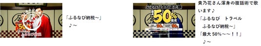 本作品では、貴乃花さんが、お馴染みの歌にのせて“ふるなびのお得なキャンペーン”や“ふるなびトラベル” “ふるなびカタログ”の魅力を紹介しています。