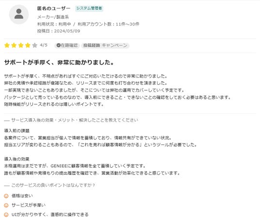 また、同日に発表された「BOXIL SaaS AWARD Spring 2025」のSFA(営業支援システム)部門では、5期連続で「Good Service」を受賞しました。