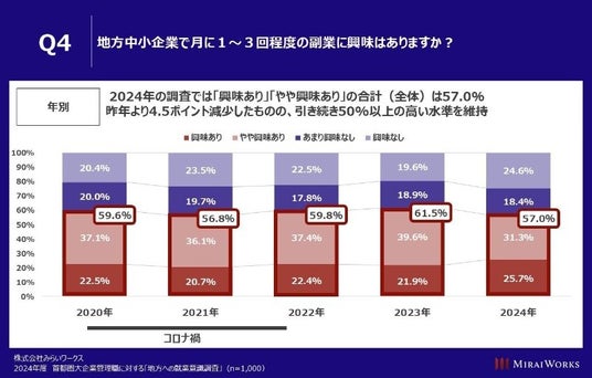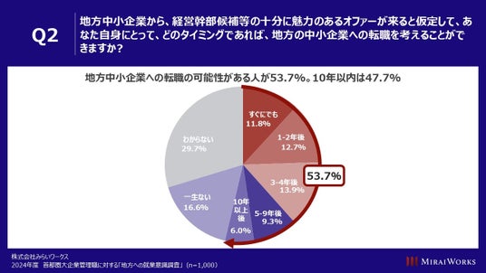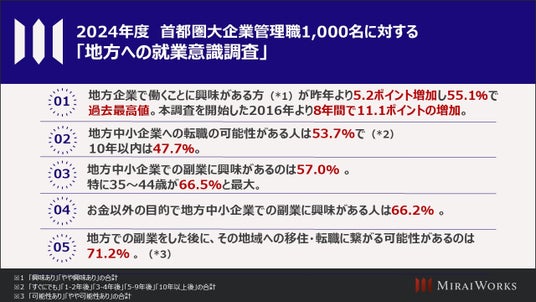 株式会社みらいワークス(本社:東京都港区、代表取締役社長 岡本 祥治、以下「当社」)は、首都圏大企業管理職1,000名に対する「地方への就業意識調査」を実施しましたので、お知らせいたします。