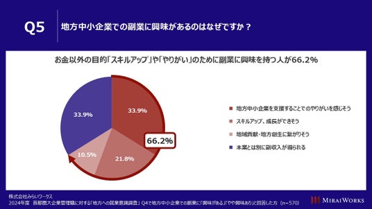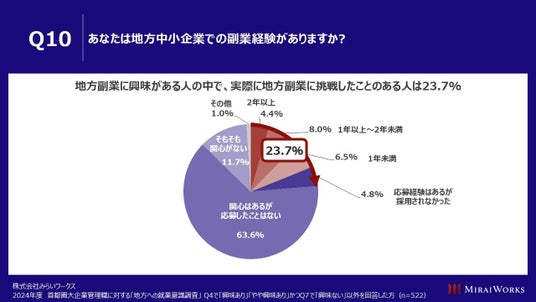 地方中小企業での副業に興味がある人は全体的には昨年より4.5ポイント下がったものの、57.0%と引き続き半数以上の高い水準を維持しています。地方副業に興味がある理由の66.2%は、お金以外の「中小企業を支援することでやりがいを感じそう」「スキルアップ、成長ができそう」「地域貢献・地方創生に繋がりそう」といった目的でした。しかしながら、地方副業に興味はあるものの、実際に地方副業に挑戦した事のある人は23.7%と、興味がある人のうち半数以下が行動に移せていない現状です。