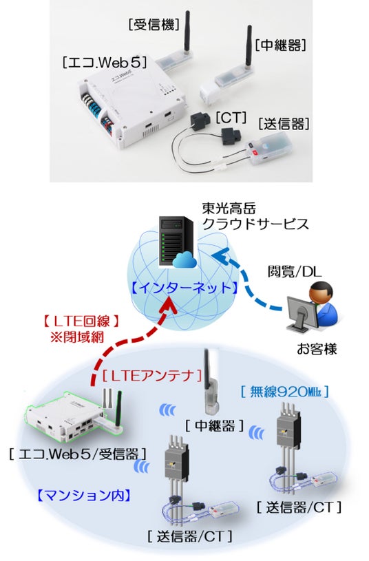その中でも、エネルギー計測システム「エコ.Web5」は、東光高岳がEMS サービスのゲートウェイ装置としてこれまで提供してきたエコ.Web シリーズの最新鋭機にあたり、無線電流センサ(受信機・中継器・送信機)を使い、多様なエネルギー(電気・ガス・水道等)の使用量をクラウド上で一元計測・管理できるエネルギーマネジメントコントローラです。