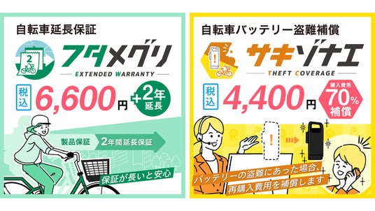 新サービス商品、自転車延長保証「フタメグリ」は6,600円(税込)で、製品に付帯する保証を2年間延長するサービスです。また、自転車バッテリー盗難補償「サキゾナエ」は4,400円(税込)で、バッテリーの盗難にあった場合、新しいバッテリーを購入する費用の70%を補償します。