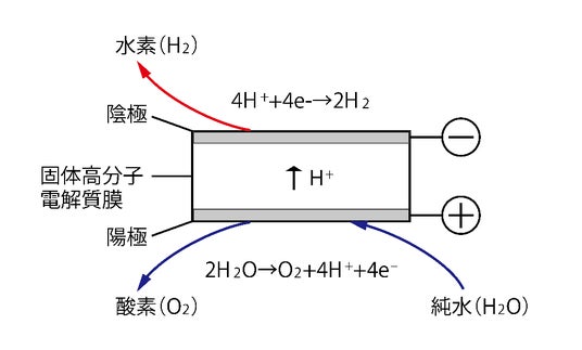 図のように、フッ素樹脂系の固体高分子電解質膜の両面に、膜と一体化する形で白金族金属からなる触媒電極を接合し、片方を陽極、もう片方を陰極とします。陽極側に水を供給しながら、両電極間に直流電圧を印加すると、図に示す反応式に従って、陽極側から酸素ガス、陰極側から水素ガスが発生します。