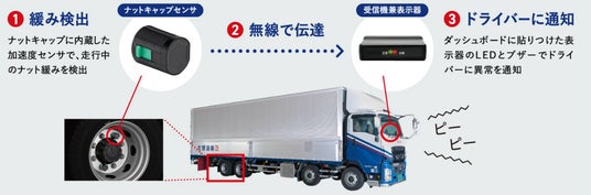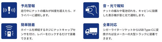 このたび採用された「天護風雷」は、当社の従来製品開発で培ったセンサー・通信技術を活かすことで、走行中であってもタイヤを固定するナットの回転角をリアルタイムで検知することが可能となるため、ドライバーへ早い段階で車輪脱落の予兆を通知することができ、ドライバーの経験に頼ることなく、より正確に、且つ、容易に車輪脱落の予兆を把握することができるため、ドライバーの負担軽減も期待できます。