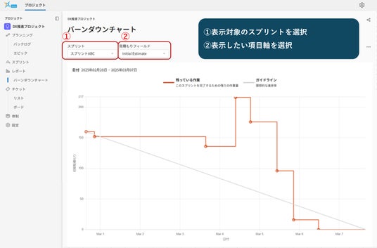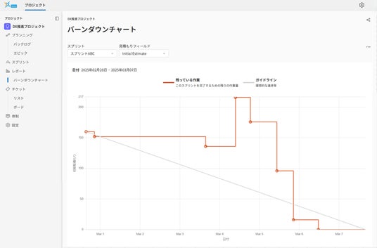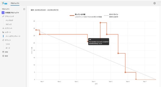 本機能により、指定作業期間(スプリント)のタスク残量の推移をリアルタイムで可視化し、チームの作業量(ベロシティ)や進捗状況を直感的に把握することが可能になります。