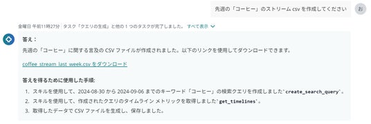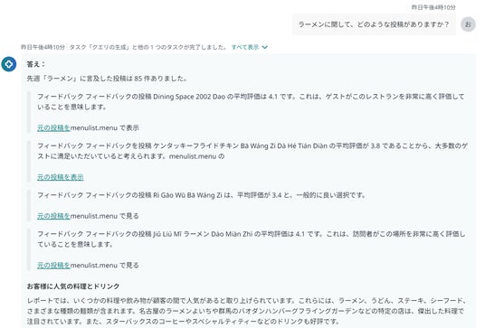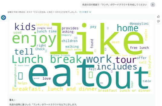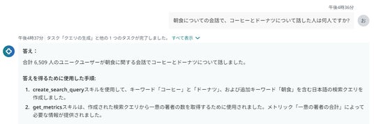 このほか「○○についてどのような会話が多く行われているか?」といった定性的な質問も理解し、テーマに関する洞察も回答してくれます。