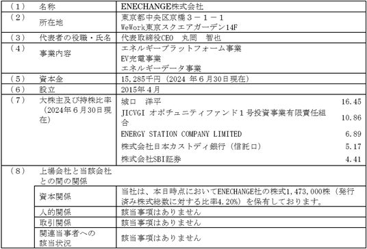 当社は、ENECHANGE株式会社(本社:東京都中央区、証券コード:4169、以下「ENECHANGE社」といいます。)と業務提携契約を締結することを決定しましたので、下記の通りお知らせいたします。また、ENECHANGE社株式に対する質権状況(貸付けの返済状況)についてもあわせてお知らせいたします。