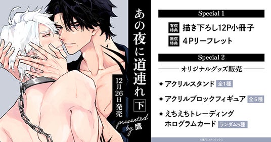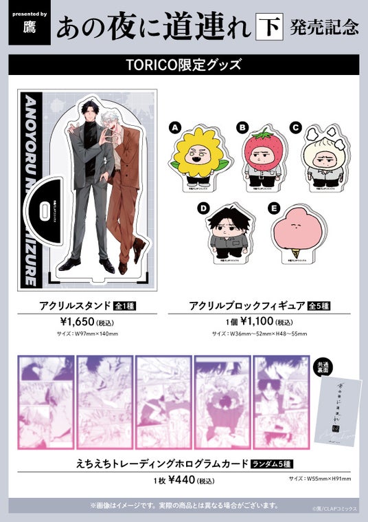 株式会社TORICO(本社:東京都千代田区、代表取締役社長:安藤拓郎)が運営するホーリンラブブックスにて、鷹先生『あの夜に道連れ(下)』発売記念グッズを販売いたします。