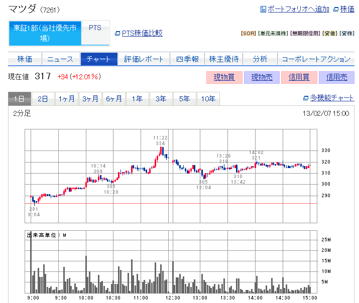 マツダが引け後に決算を発表。 大方の期待通り大幅な上方修正してきました。 しかも12月までの第3四半期で為替差益が44億円発生とのIR。しかし実際に円安になったのは11月半ばだから、この第4四半期での為替差益はいくら出るんでしょうね。ちなみに第4四半期は1ドル85円、1ユーロ110円を想定らしいですが、今日は1ドル94円タッチし1ユーロ127円など、想定レートよりかい離がさらに大きくなってます。1... ...続きを読む